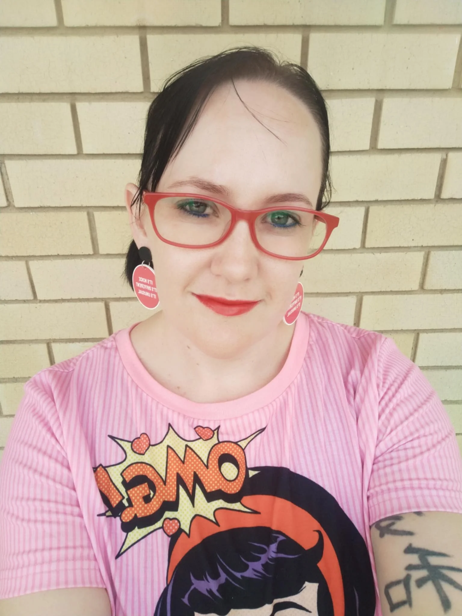Person wearing red glasses, large circular earrings, and a pink shirt with a comic-style design, standing against a brick wall.